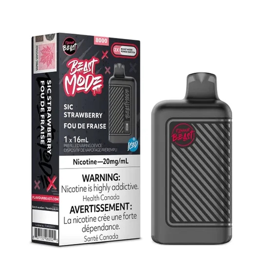 The Flavour Beast Mode Rechargeable Disposable 8000 Puff Vape. It features Beast Mode which ups the power to the 0.8ohm dual mesh coil with a looser airflow. Standard mode which is what you will remember from the Flow runs a 1.2ohm single coil with standard airflow. With 16ml of 20mg salt nicotine prefilled e-liquid the thing goes on for days. The Beast Mode will allow you to recharge it to vape the last bit of ejuice.